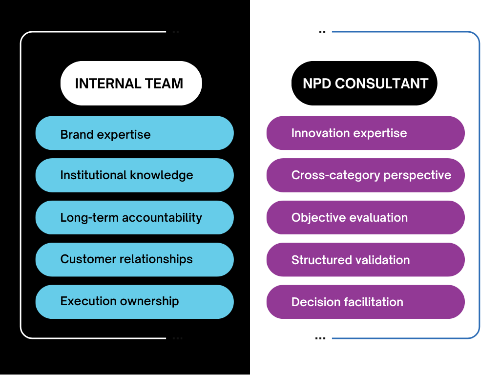 New product development services are most effective when brands clearly define what to own internally versus what to outsource. Internal teams bring brand knowledge, context, and long-term accountability, while external partners provide objectivity, specialized innovation expertise, and decision structure. T